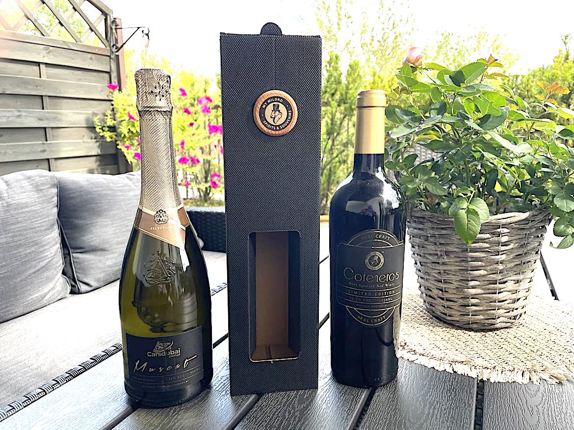 Teoretycznie niby białe nie jest winem prezentowym ale w zestawie nie musi byc to prawda. Róznie twierdzi rynek na temat tego czy białe napoje tego rodzaju sa też idealne na to aby mogły zadowolic jako prezent ? Spotykamy sie z róznymi oponijami na ten temat, ludzie maja bardzo rózne zdanie czy jest czy nie jest prezentowe. My na podstawie sprzedazy i ilości jakie przekazalismy dla klientów możemy tylko domniemac, że nie jest to popularne wino w prezencie. Lekkie raczej nazywane deserowe nie sa tradycyjnym upomnikem. Nie wiem skąd wzieło sie takie parcie na prezentowe ale czerwone ale tego sprzedajemy, nawięcej i w dużych ilościach. Zestaw z wyjatkowym białym o nucie półwytrawnym winem o pojemności 750 ml.